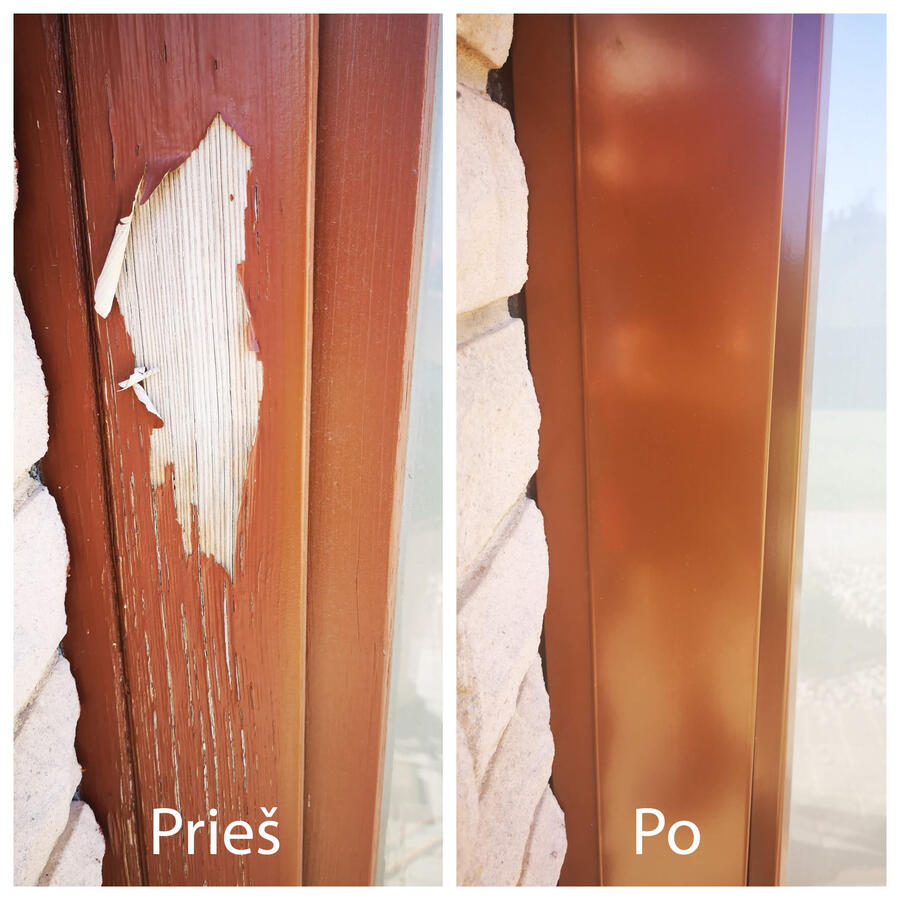 Palyginkite, kaip atrodo senas medinis langas ir tas pats langas po apkaustymo aliuminiu. Aiškus skirtumas – estetiška, tvarkinga, apsaugota.